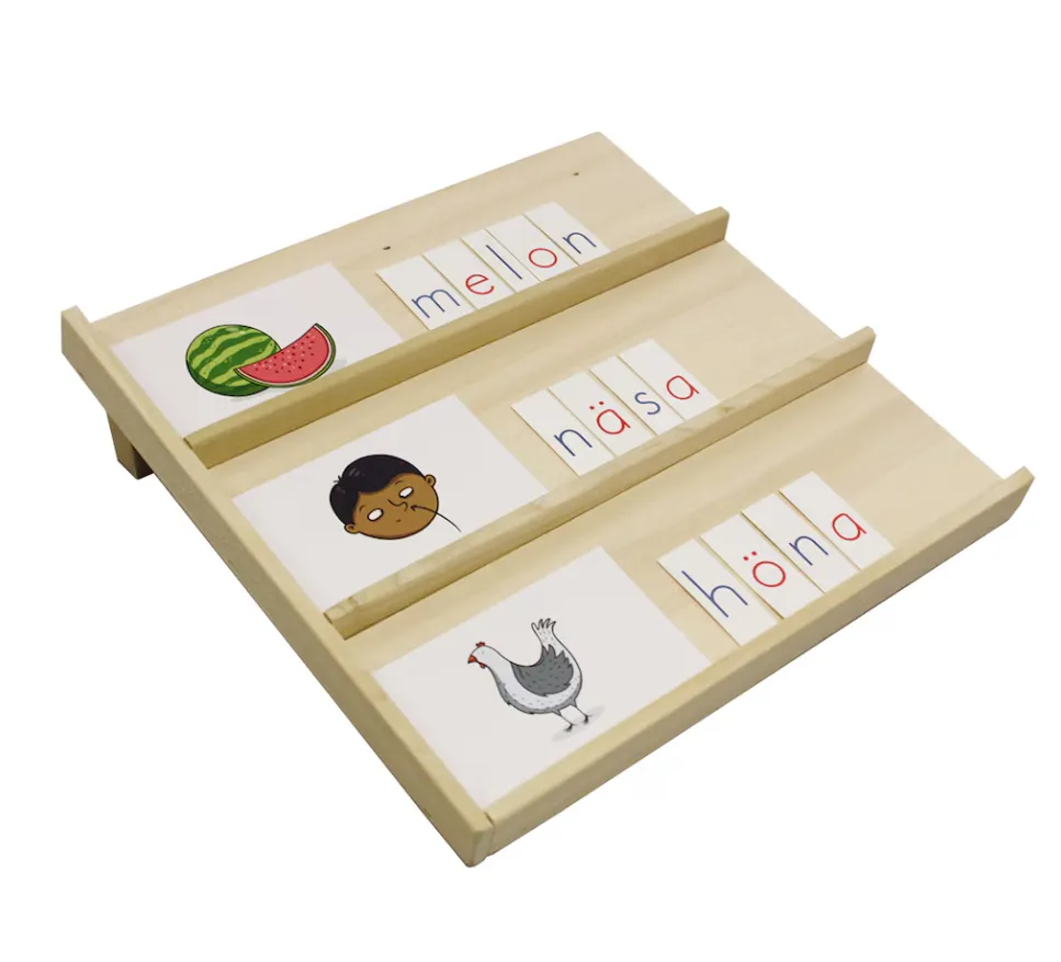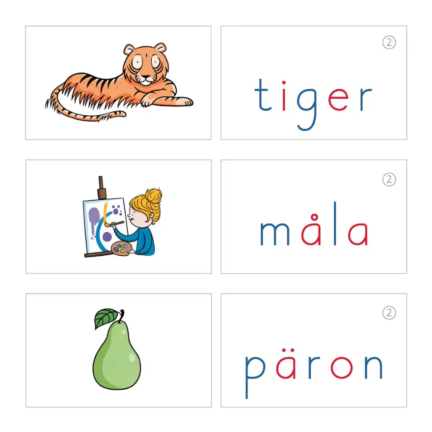 Skrivkorten används med fördel tillsammans med Bokstavslådan, men självklart kan du välja att låta eleverna skriva orden på papper i stället. Oavsett vilket kan eleverna rätta själva, genom att vända på bildkortet och jämföra baksidans text med sitt eget ord.
