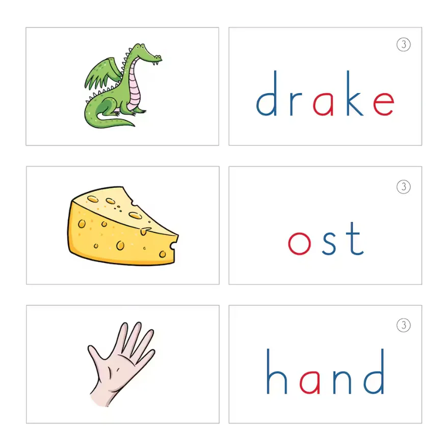 Skrivkort med ljudenlig stavning 3 innehåller 30 kort. Orden består av 3, 4 eller 5 bokstäver, med konsonantförbindelse.