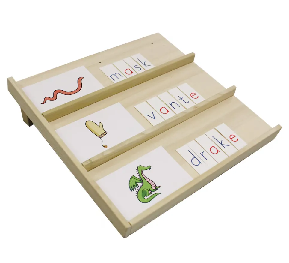 Skrivkorten används med fördel tillsammans med Bokstavslådan, men självklart kan du välja att låta eleverna skriva orden på papper i stället. Oavsett vilket kan eleverna rätta själva, genom att vända på bildkortet och jämföra baksidans text med sitt eget ord.
